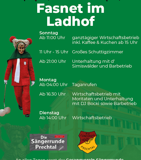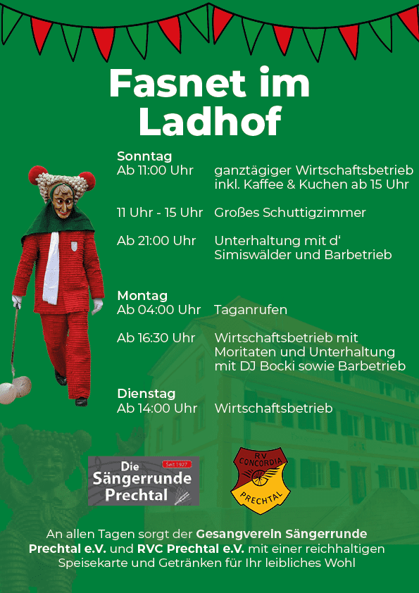 Der Gesangverein Sängerrunde Prechtal e.v. und RVC Prechtal e.v. bewirtet dieses Jahr den Ladhof an der Fasnet 2023. Wir freuen uns auf Ihren Besuch und wünschen eine glückselige Fasnet – Trallaho.